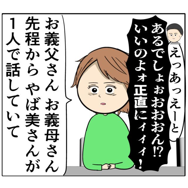 「えっ、あっ、えーと・・」と良し男さんが話しにくそうにしていると「あるでしょぉおおおん!?いいのよォ正直にィィィ!」とやば美さんがまくし立てますが、「お義父さん、お義母さん、先ほどから、やば美さんが1人で話していて・・」とすみれさんが義両親に話しかけました。