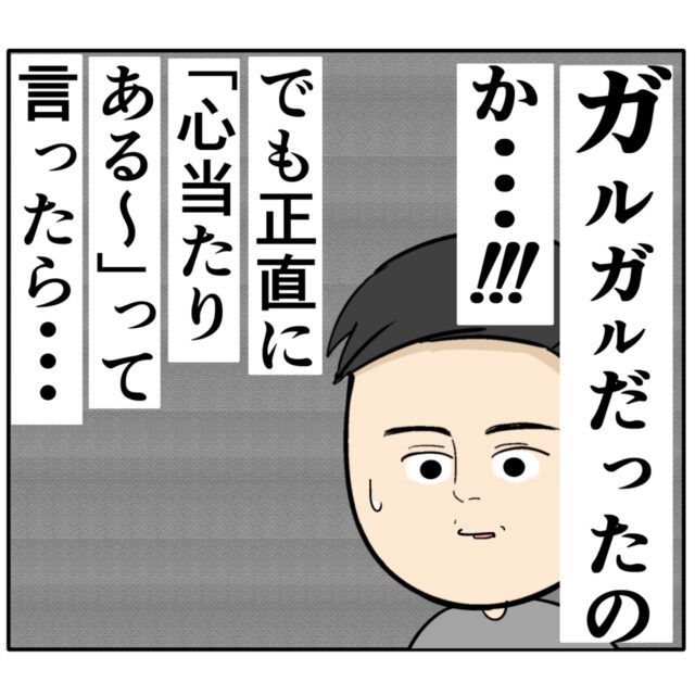 すみれさんが産後のガルガル期だと決めてかかるやば美さんは、「良し男も心当たりあるんじゃぁない?」とたずねました。そう言われて「ガルガルだったのか・・!!」と驚く良し男さんは「でも正直に『心当たりある~』って言ったら・・」と心の中で呟きます。
