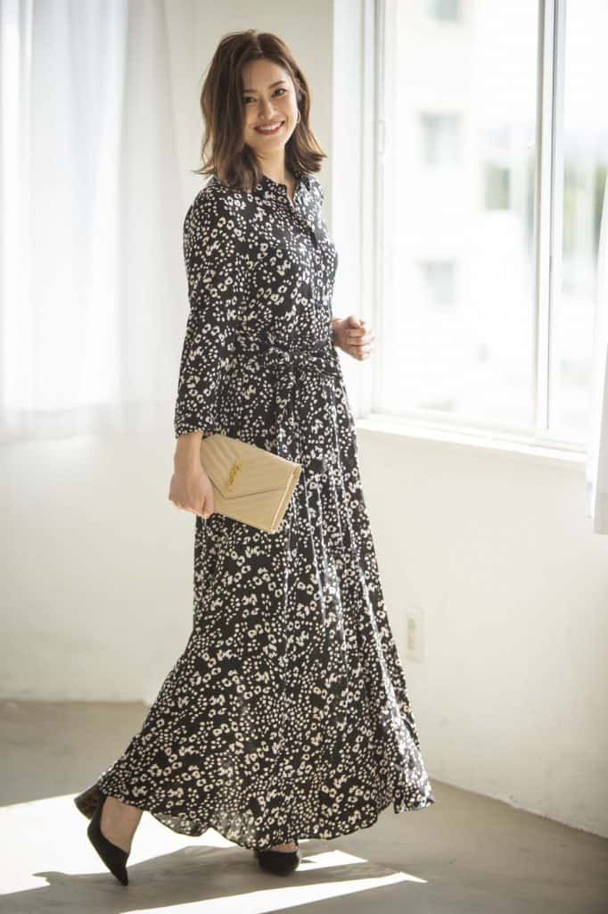 キレイめコーデが素敵な井上 友美さんは、モノトーンのレオパード柄のロングワンピをヒール×クラッチと合わせてエレガントな印象に。レオパード柄だけど、柄が小さめでブラックベースなので、激しすぎないのがアラサー世代には嬉しい。スニーカーと合わせてカジュアルダウンしても使えるから◎。(井上友美さん 外資系金融関係勤務・30歳 162cm)