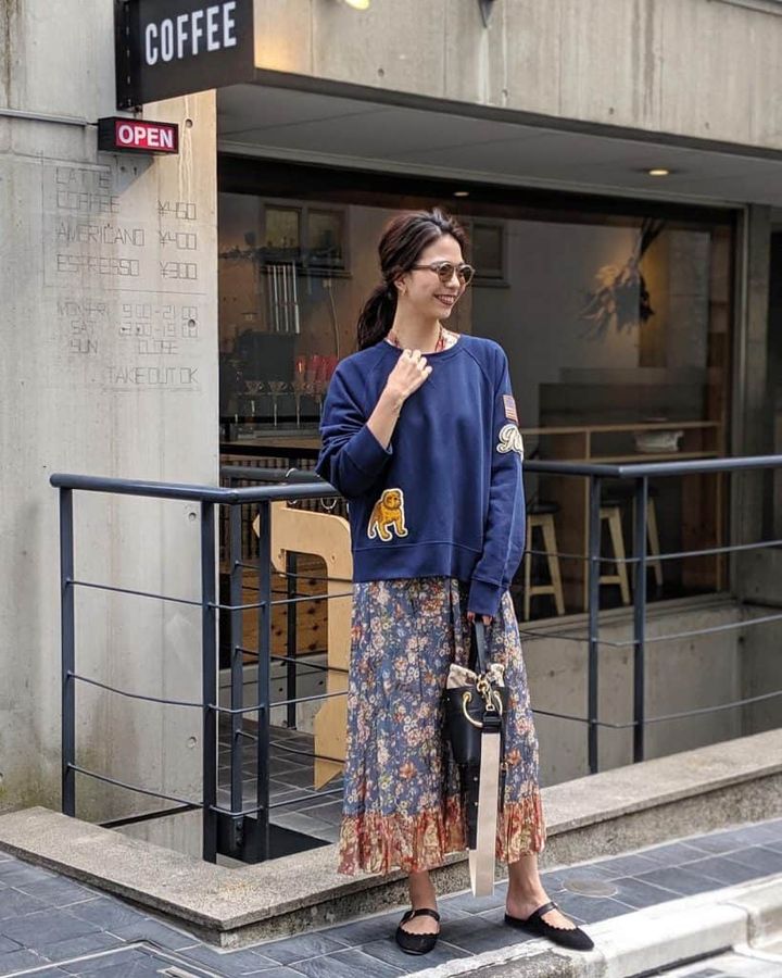 ハイセンスなコーディネートに定評がある佐藤 匠さんは、ZARAの花柄ワンピにラルフローレンのスウェットをオン。柄ワンピは1枚で着るだけではなく、スウェットトップスを合わせることで程よい抜け感を演出できます。(佐藤 匠さん ファッションコーディネーター・28歳 173cm)