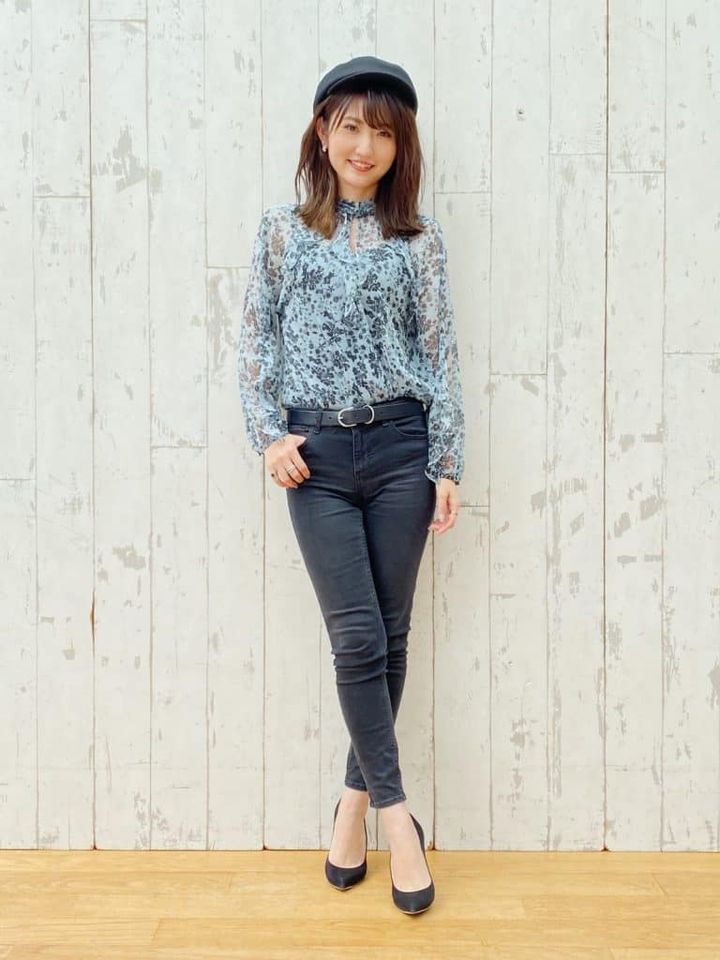 コンサバなオシャレが得意な立川 沙也香さんの休日コーデは、ZARAの柄ブラウスにスキニーデニムを合わせてスタイルアップ!華やかなブラウスが、オシャレ度をグッと上げてコーディネートのポイントになっています。(立川 沙也香さん 広告代理店勤務・31歳 167cm)