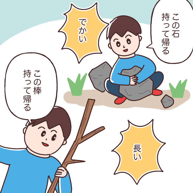 道を歩けば「この石持って帰る!」どこから見つけてきたかわからない大きな石。公園に行けば「この棒、持って帰る!」とそれはそれは長い木。何度行っても同じ子を繰り返す息子。