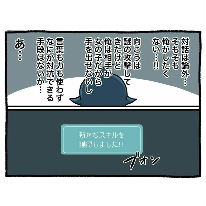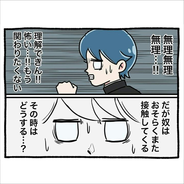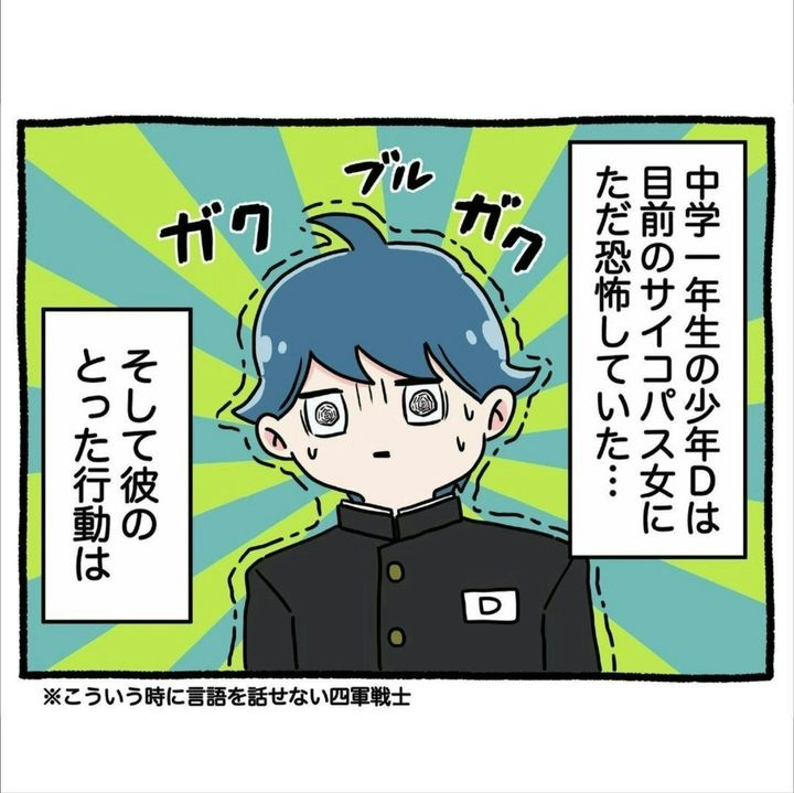 今回のケースでは、Dちゃんさんによる独自の対策で撃退できましたが、学生同士とはいえ、身の危険を感じたら信頼できる大人に相談することも大切。「万が一わが子が学校で付きまとわれたら?」など、自分や子どもに置き換えて対策を考えておきたくなる作品です。