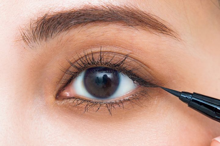 目頭と目尻のみにラインを引き、つなげず抜け感を。目尻は少し下がり気味に引くことで目力アップ。下のアイラインは点づけし、柔らかい印象の仕上がりに。