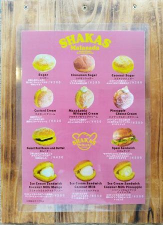 メニューはこちら。「シュガー」(280円)「シナモンシュガー」(290円)「ココナッツシュガー」(290円)「カスタードクリーム」(430円)「マカダミアホイップクリーム」(450円)「パイナップルチーズクリーム」(380円)「あんバター」(430円)「スパムサンド」(500円)「ココナッツミルクアイスマンゴー」(580円)「ココナッツミルクアイス」(550円)「ココナッツミルクアイスパイナップル」(580円)。11種類のマラサダを販売しています。