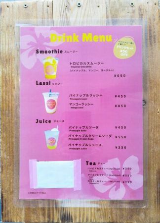 スムージー、ラッシー、ティーなどトロピカルなドリンクも各種あり。マラサダと一緒に購入で50円引きになります。