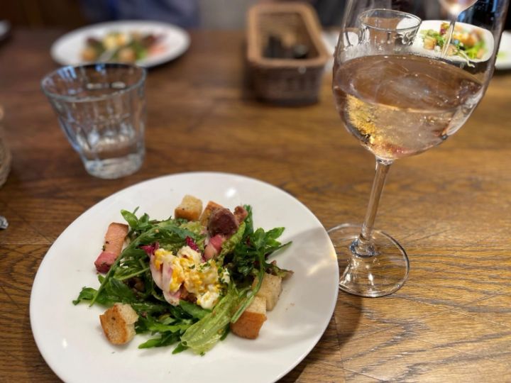 自家製ベーコンと砂肝のリヨン風サラダ。氷入りのロゼで爽やかに。