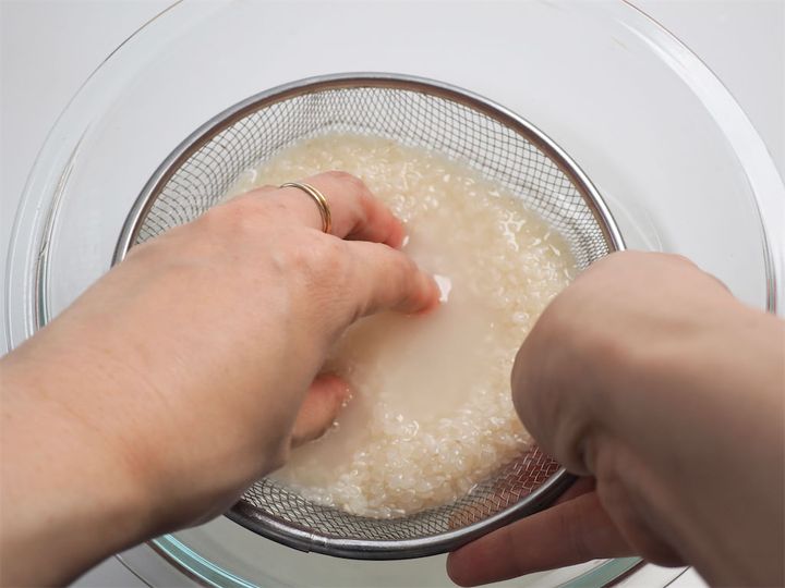 強く研ぐ必要はないのでやさしく洗っていきましょう。だれウマさんによると、昔と違い精米技術が発達しているため、今のお米はあまりしっかり研いでしまうと栄養や旨味流出&お米が割れてしまうのだそう。①水をためたボウルにザルに入れたお米をつけ、軽く混ぜ合わせたらすぐに引き上げる。②ボウルの水を変えたらまたザルをつけやさしく混ぜる。②を2〜3回繰り返し、水が半透明になればOK!
