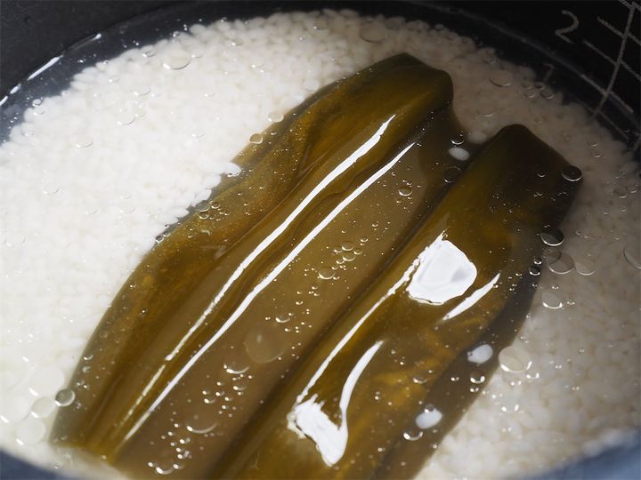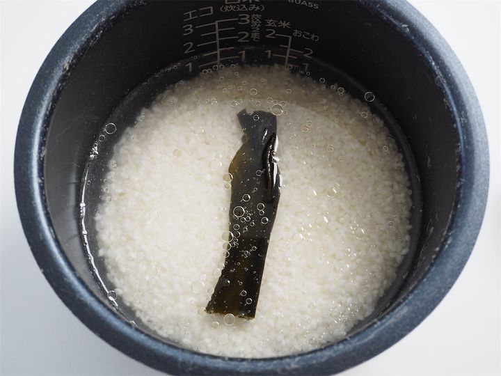 2. 炊飯釜に1、昆布、清酒、油を入れ米を平らにならしたら1.5合分の水を入れ、冷蔵庫で1時間浸水させる。
