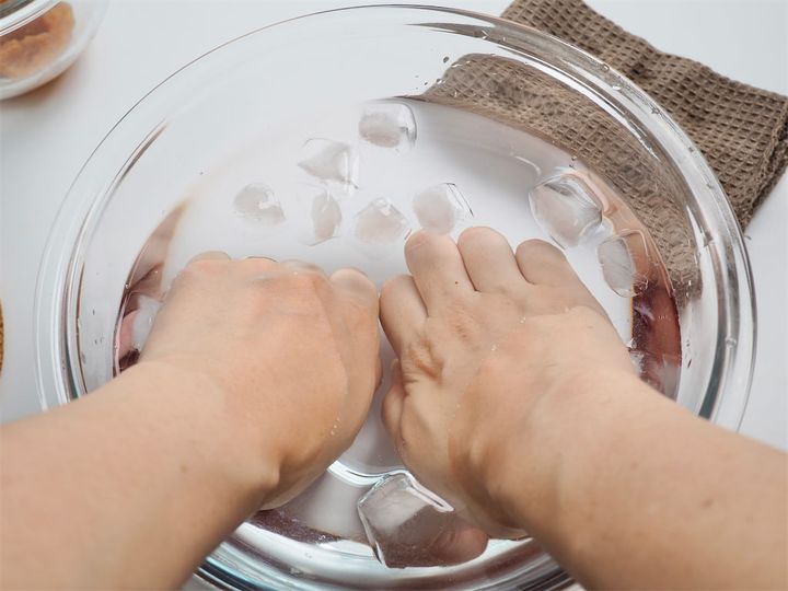 6. 3が炊き上がったら、氷水を張ったボウルと布巾、塩を用意して、氷水に15秒ほど手を浸ける。