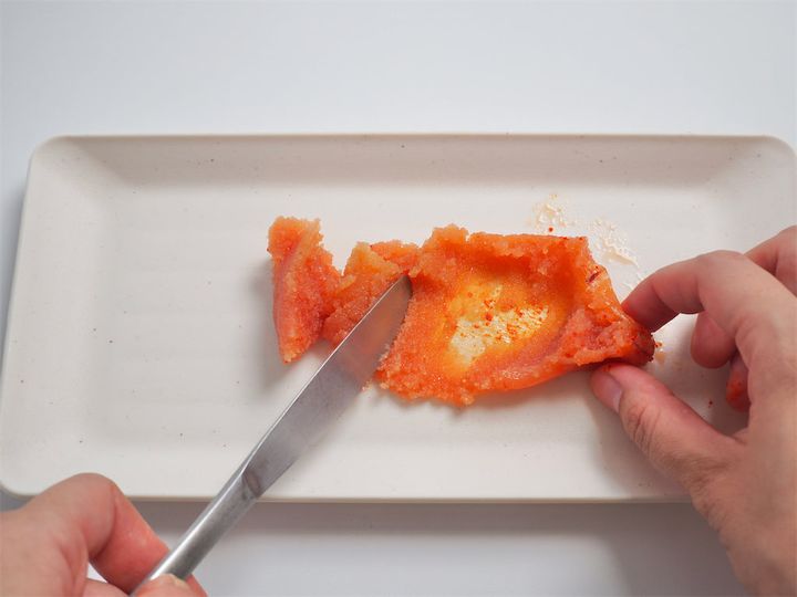 4. 明太子を薄皮をから取り除く。