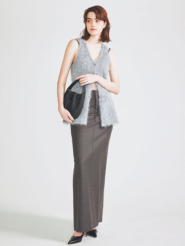 【POINT】ペンシルスカートを合わせてIラインに整えると、立体感のあるシャギーベストをスマートにまとえる。コンパクトな黒のレザー小物でさらに切れ味よく。