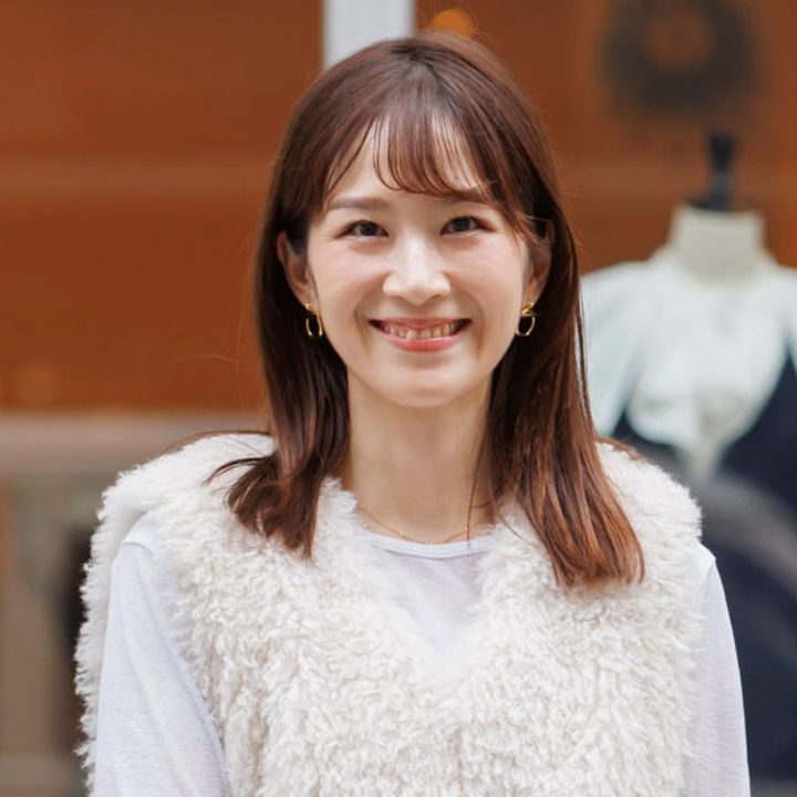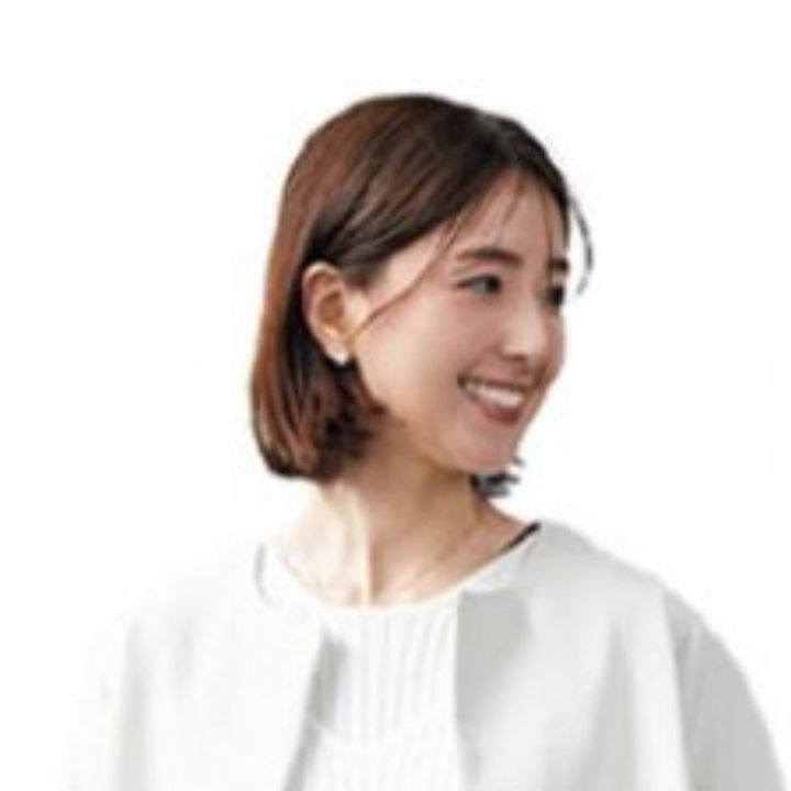 コンサバになりがちな内巻きボブは、シースルーバングでアップデート。ヘアオイルで全体の質感を整えたら、指先に残った少量のオイルで前髪をスタイリングすると、ベタっとした質感になりません。細かい毛束を作るように指先で整えるのがポイント。(藤原紗由里さん)