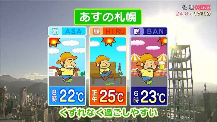 あすは割合穏やかで極端な暑さもありません。週の真ん中ですが、ビアガーデンに行くにもちょうどいいお天気となりそうです。