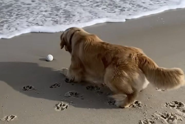 3. 波打ち際でおもちゃを拾おうと頑張る犬さん、思わず応援したくなる!