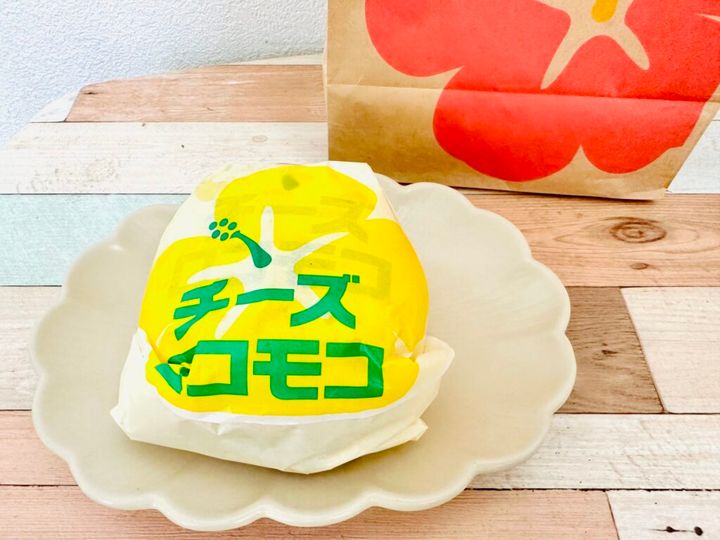 「チーズロコモコ」は、粉チーズがトッピングされた香ばしいバンズ、100%ビーフパティ、厚みのあるたまご、とろけるチェダーチーズがはみ出るほどたっぷりとサンドされています。