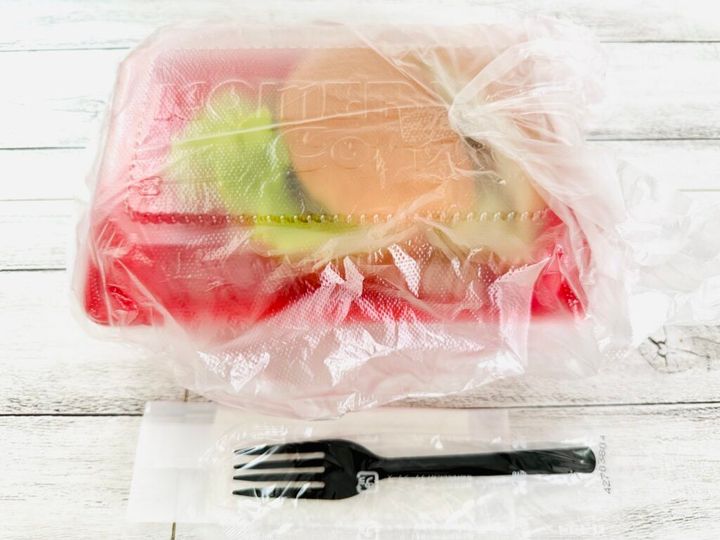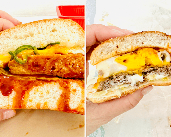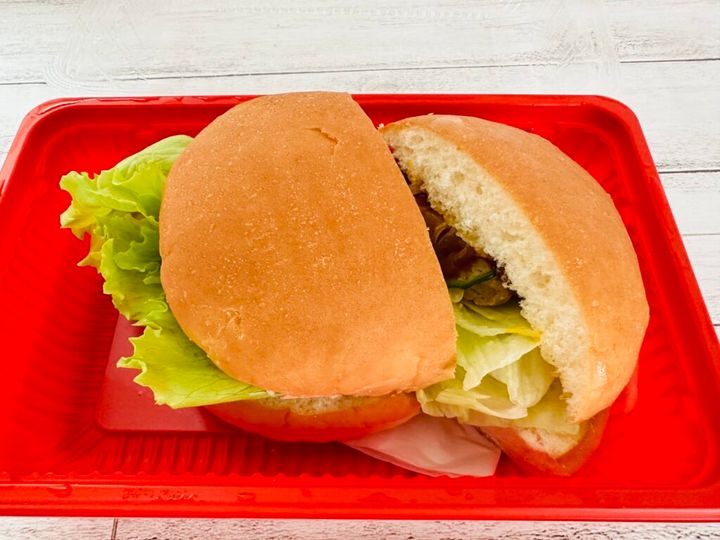 以前にサンドイッチをテイクアウトした際には専用ボックスがぴったりサイズだったのですが、バーガー1個でも同じ容器なのでやや空間ができていました。イートインでの注文時と同じように、指定すればサービスでカットしてもらえますが、持ち帰りの際は崩れないようにご注意くださいね。