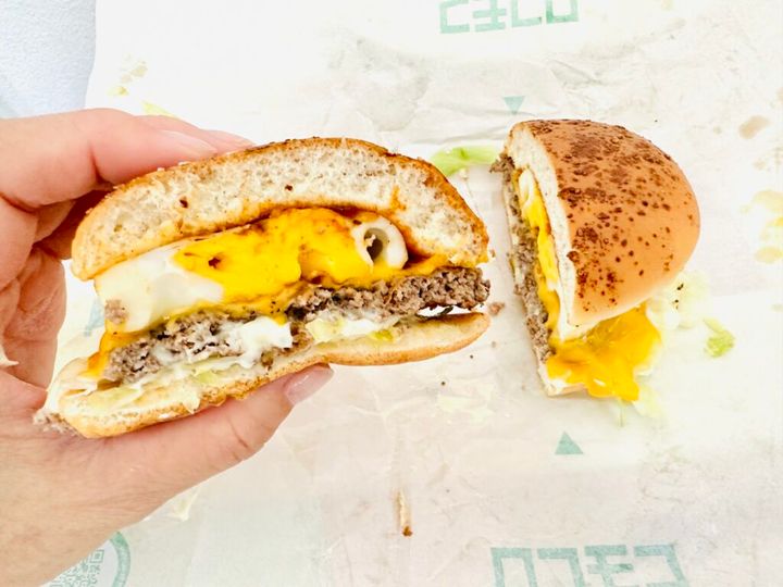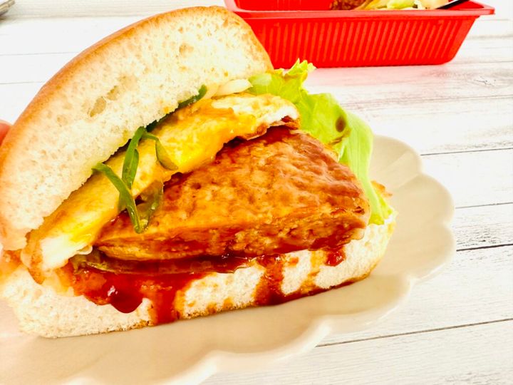 バンズに負けない厚さのハンバーグ、薄焼きなのに黄身がとろりとこぼれる不思議なオムレツ、絶妙な旨味のドミグラスソースがたっぷり。とにかくバーガーチェーン店には類を見ないサイズ感なので、食べごたえ十分でした。