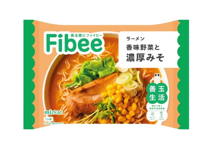 全粒粉とオーツ麦から作ったこだわりの麺と、香味野菜を効かせたスープ。発酵性食物繊維を配合。Fibeeラーメン 香味野菜と濃厚みそ 1食¥267(ミツカン TEL:0120・261・330)