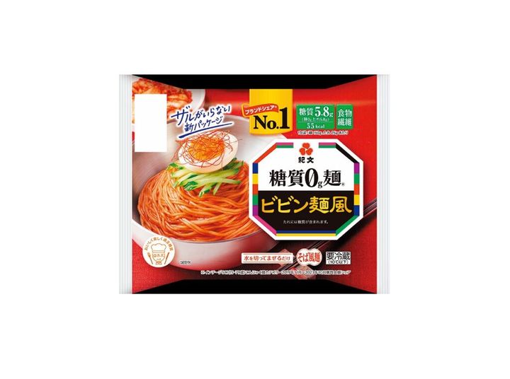 おからパウダーとこんにゃく粉で作った麺。食物繊維が含まれて低カロリー、お皿不要で便利。糖質0g 麺ビビン麺風 麺 150g、添付タレ 25g¥216*編集部調べ(紀文 TEL:0120・012・778)