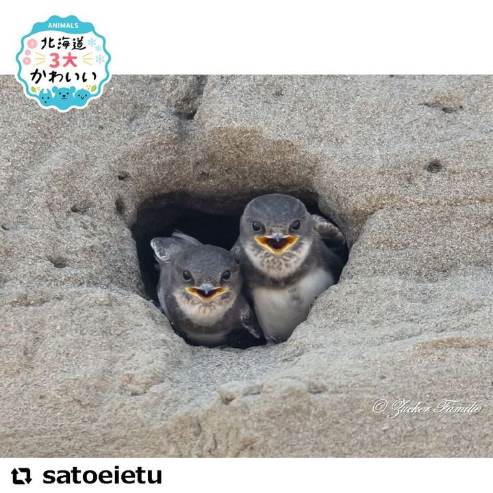 おもに海岸や川などに近い、砂地の崖などに、集団で小さな穴を掘って巣穴にするため、「小洞燕」と呼ばれるようになったのだそうです。おそらく、親鳥がエサを持ってくるのを待っていたヒナたちが、親鳥の姿を見つけて、「ママ!こっちこっち!」って言っているときのお写真だと思います。