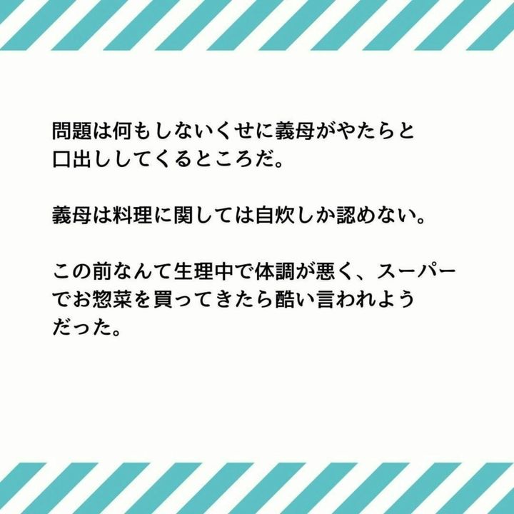 そういった準備もなく、自分勝手にやってきた義母。しかも、義母はヒロミさんをすぐにののしる人でした。生理で体調が悪いヒロミさんを思いやることや、家事を分担することはありませんでした。そんな人だと分かっていたら、同居なんてしたいと思わないですよね。