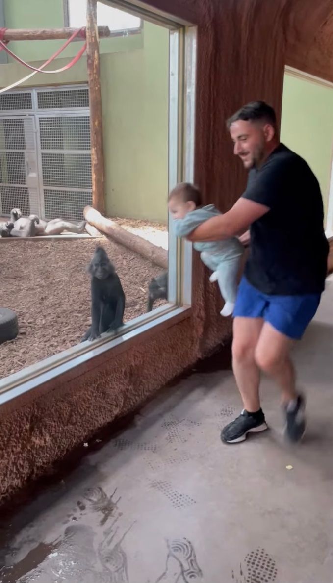 パパに抱っこされている赤ちゃんのことを、ガラスに張り付くようにして眺めているサル。 この子は、自分と同じくらいの体格をした赤ちゃんに興味津々のようです。