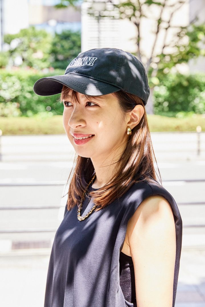 「ユニクロのハットはベージュもありましたが、試着してみて顔映りがよく見えた黒をチョイス。 普段からキャップはよく被りますが、バケハは初めてだったのでまずはプチプラから挑戦。合わせやすく、買ってよかったなと思っています。車移動が基本なので折り畳んでバッグに入れられるのもポイントが高く、汚れても気にならない手軽さがありがたいです」山内めぐみさん・153cm(パート/7歳男の子と2歳女の子ママ)
