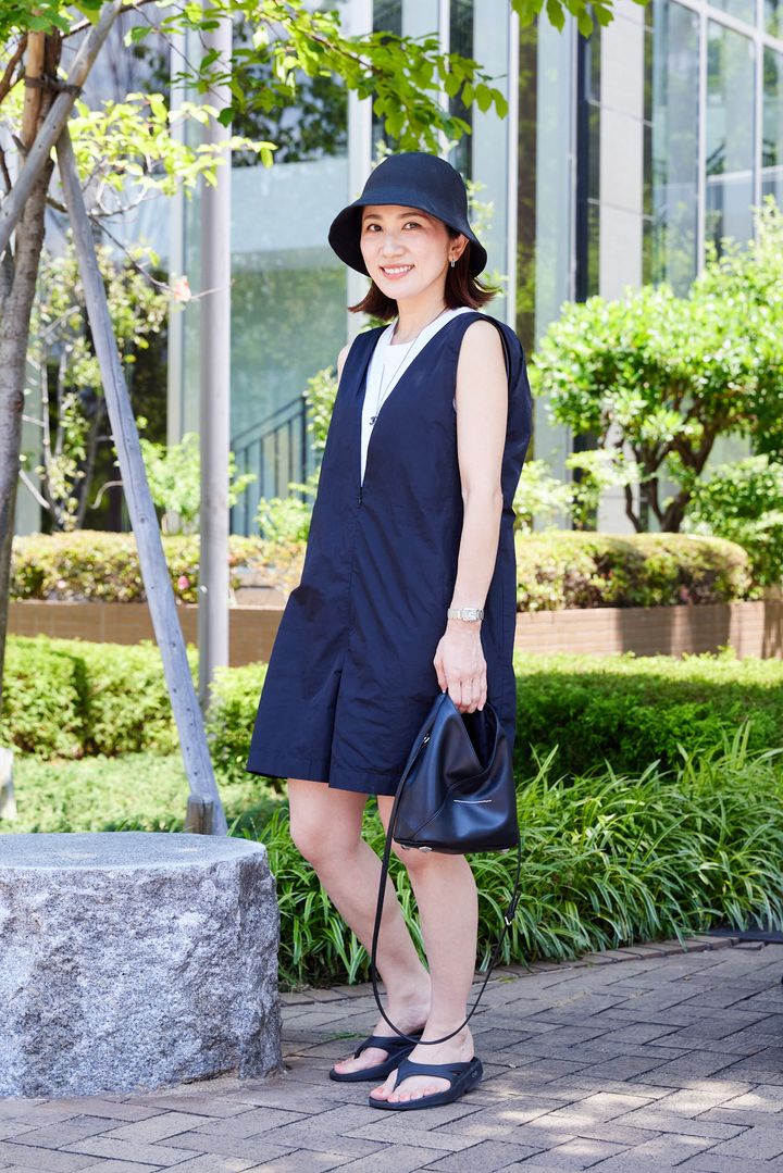 「息子が水遊びを楽しむ年齢になったことで急遽水際ウエアが必要になり、取り急ぎで購入したのがこの撥水のオールインワン。ユニクロならサイズ感がわかっているのでネットで選べて、結果とても重宝しています。昨年のアイテムですが、黒だと飽きがこなくて着回しも効くので買ってよかったです」中山 希さん・156cm(医師/2歳の男の子ママ)