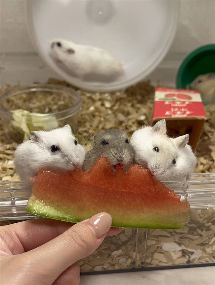 3匹のハムスターが夢中で食べているのは・・・。 スイカに揃ってかぶりつくその様子が、かわいいと反響を呼んでいます!