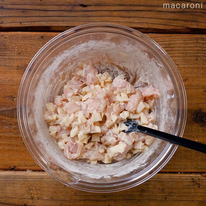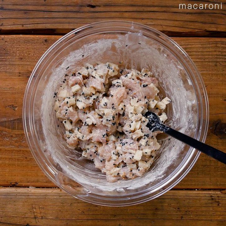 鶏肉とれんこんは大きく切るとまとまりにくいため、小さく切り揃えてください。