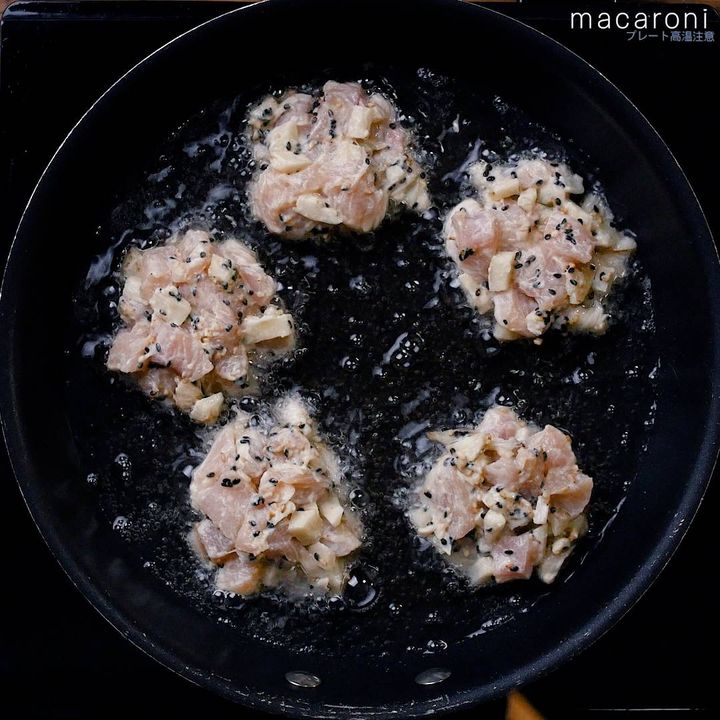 5: フライパンにサラダ油を2cm深さまで入れて170℃に熱し、④をスプーンでひと口大にすくって油に落とし、両面がキツネ色になるまで揚げたら完成です。