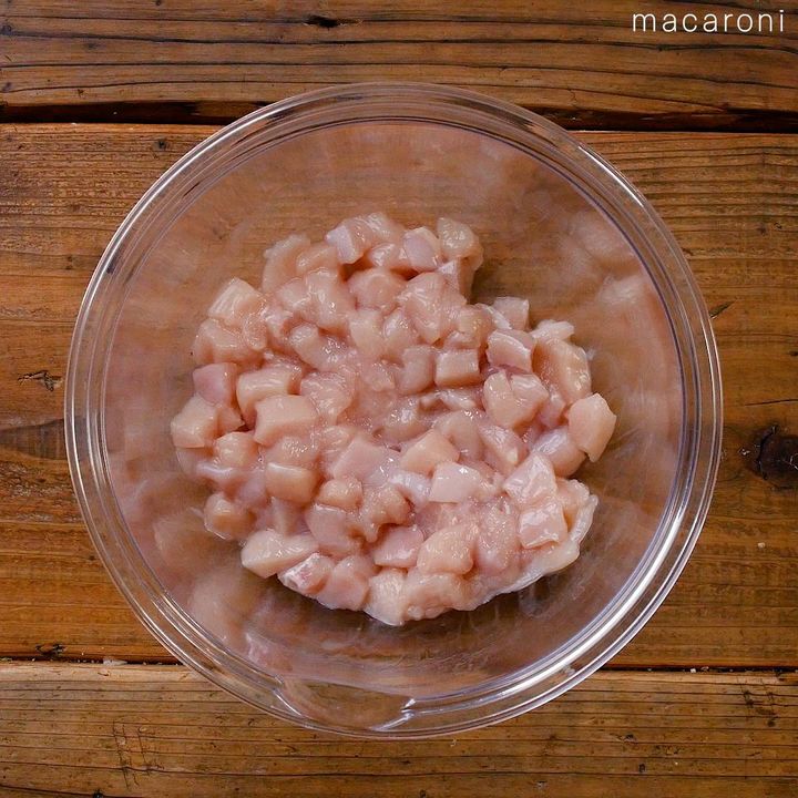 ・鶏肉は余分な皮と脂を除き、1.5cm角に切ります。
