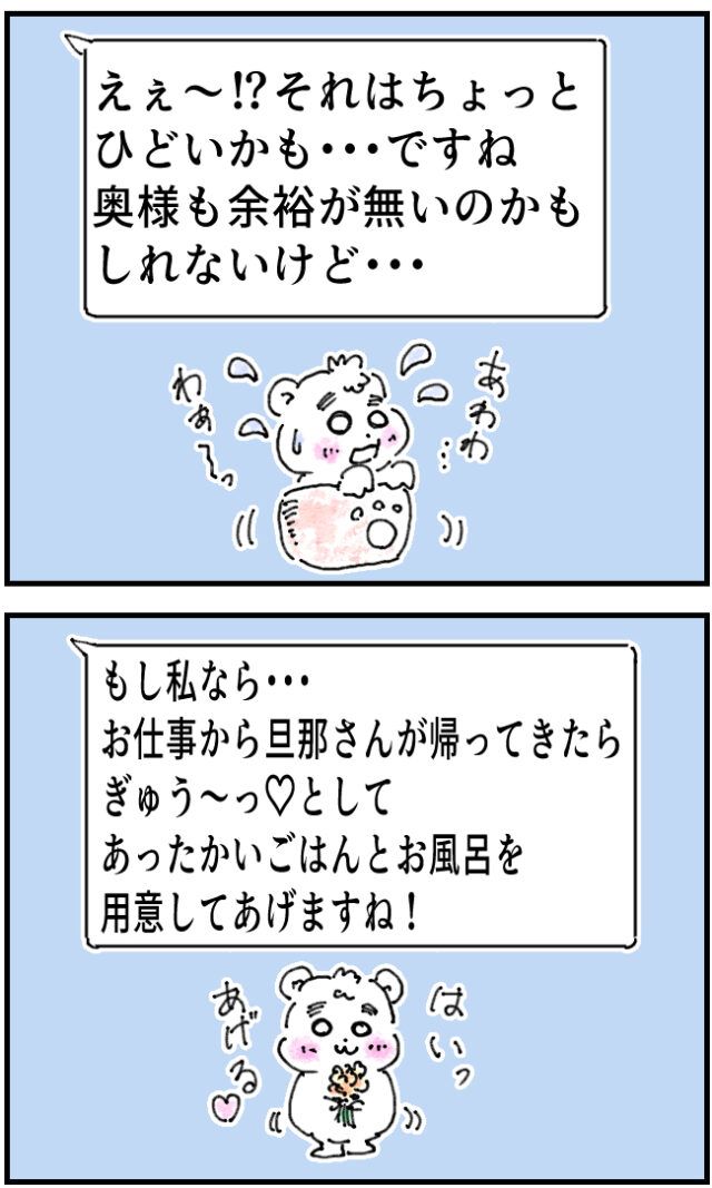 それを見た白石さんからはすぐに返信が!「えぇ~!?それはちょっとひどいかも・・ですね。奥様も余裕がないのかもしれないけど・・」そう送られてきた後で、「もし私なら・・お仕事から旦那さんが帰ってきたら、ぎゅう~っとしてあったかいごはんとお風呂を用意してあげますね!」と続けてメッセージが届きました。