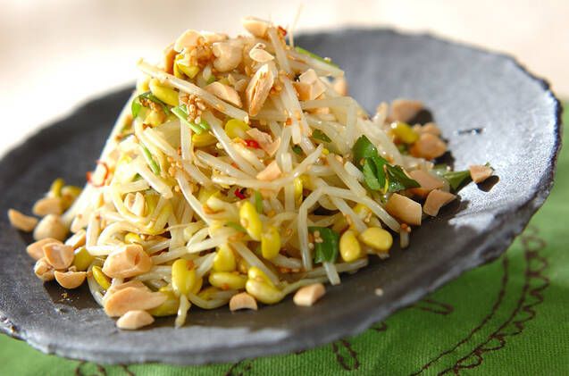 ナンプラーと香菜を使ったエスニックテイストのナムルは、ピーナッツの食感がアクセント。豆モヤシは豆の部分に火が通りにくいため、しっかりゆでて調味液と和えましょう。