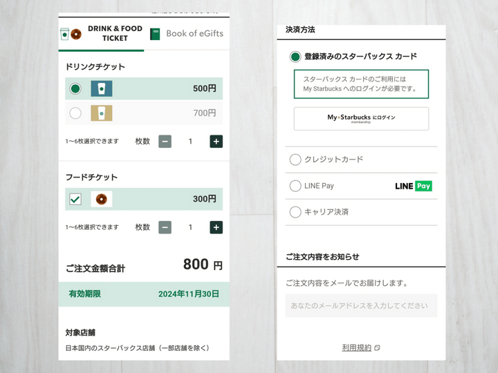 ドリンクチケットとフードチケットを組み合わせて購入します。今回の暑中見舞いではドリンク700円+フード300円を選択しました。スタバ会員以外は、決済方法で「クレカ」「LINE Pay」「キャリア決済」から選択。