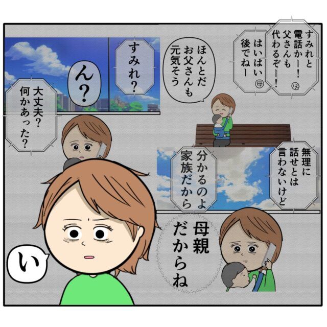 それを聞いたすみれさんの頭の中には、いつも電話ですみれさんのことを気遣ってくれる優しい両親の言葉や、電話の声だけですみれさんの様子がいつもとは違う、と心配する思いやりに感謝していることを思い出しました。