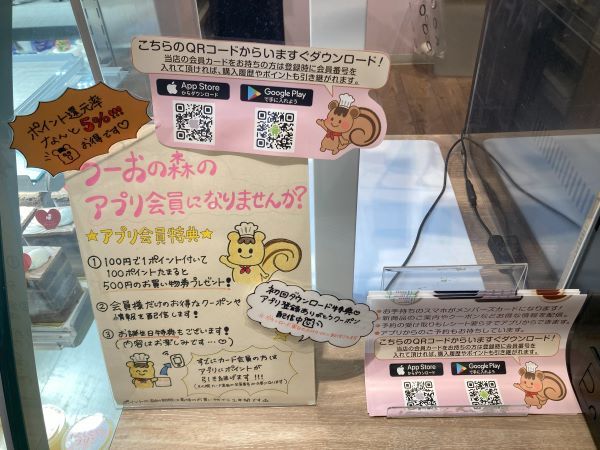 うーおの森公式アプリは会員登録・年会費無料なお得で便利なアプリです。新商品やお店の開催イベントをチェックすることができます。オンラインショップに繋がっているので限定商品の店舗取り置き、冷凍商品や焼き菓子のお取り寄せができ、自宅以外の住所にお歳暮等を注文し発送することもできます。購入時に提示すると50円で1ポイント加算され、100ポイントで500円割引になります。店頭とオンラインショップ両方のポイントが合算されます。そして購入履歴が残るので、リピートしたいケーキをすぐに調べることができます。お誕生日特典もありますよ!