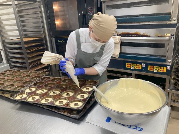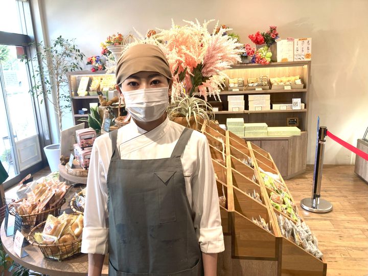 《大濵さん》厨房の見学や販売について全面的に取材に対応くださいました。先月、製造リーダーをされていた方が卒業されたため、次期リーダーになれるよう日々頑張られているそうです。お若いながらとても頼もしい存在ですね。(左側)