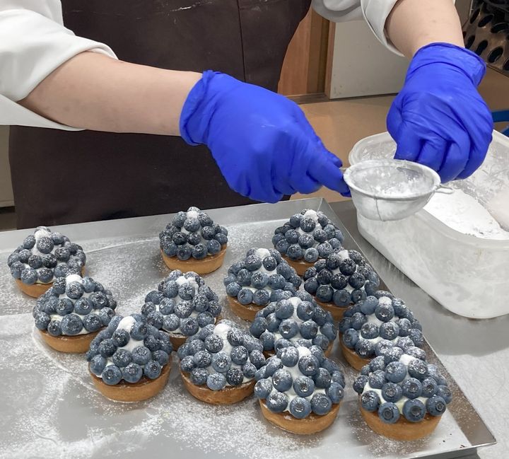 新鮮なブルーベリーを使ったタルトにひとつひとつ粉糖を