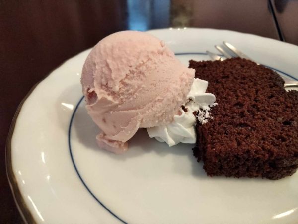 デザートメニューは2種類のスイーツが楽しめます!この日はイチゴのアイスクリームとチョコレートのケーキでした。添えられた生クリームが可愛いですね。