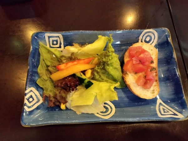 メインの料理の前に提供されるのは「サラダ」と「ブルスケッタ」です。トマトのブルスケッタはオリーブオイルとハーブの味がバケットにピッタリです。