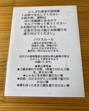 にしざわ食堂さんはちょっとしたルールがあります。テーブルの上にこちらの用紙が置いてありますが、丁寧に説明もしてくれます。
