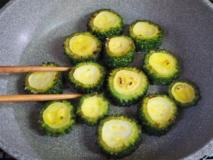 4. フライパンを弱火でしっかりと温め、ゴーヤをフライパンに軽く押さえつけるようにしながら並べていく。焼き色がつくまで両面3〜4分ほど焼いていく。