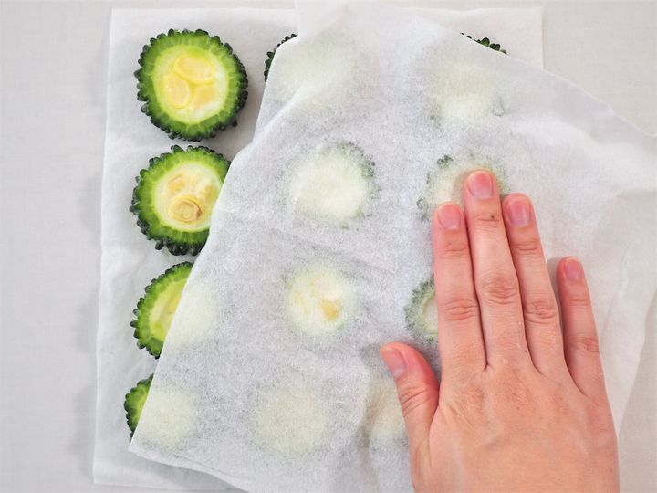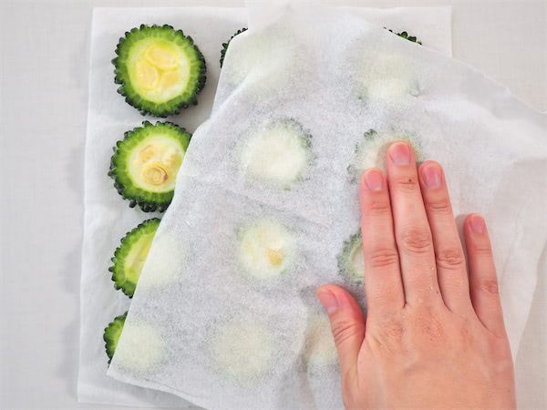 3. 10分経ったらゴーヤをキッチンペーパーの上に並べ、挟み込むようにして滲み出た余分な水分を取っていく。