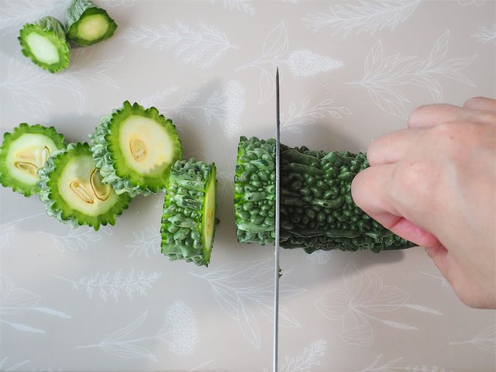 1. ゴーヤの両端を切り落とし、7〜8mm幅の輪切りにする。