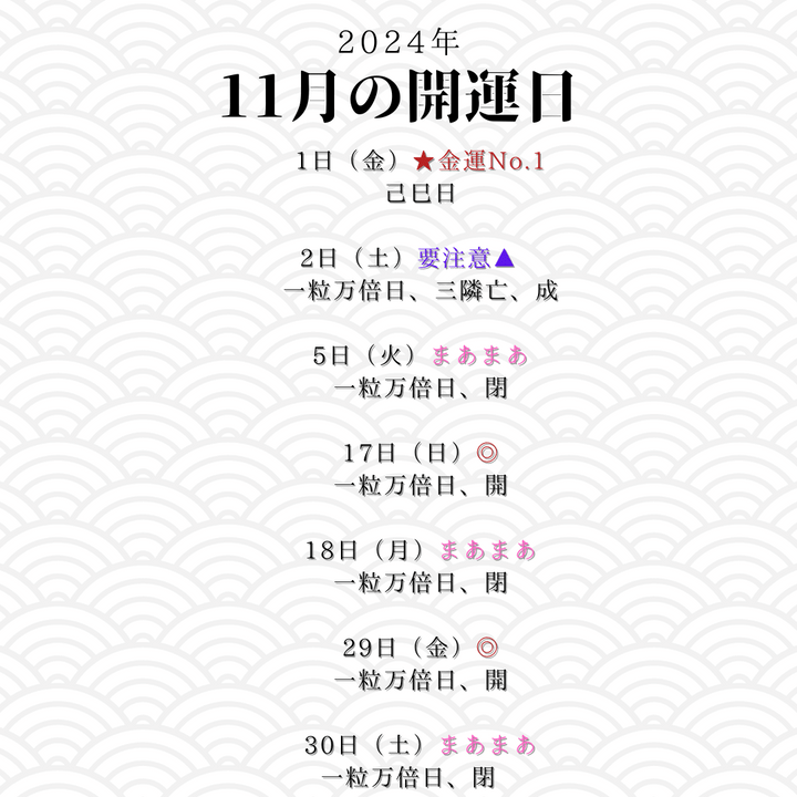 一粒万倍日+天赦日+甲子日+建という、パワフルな組合せ。甲子日は金運向上の吉日。お財布購入、高額品購入にもぴったり。2024年下半期の最強日です。