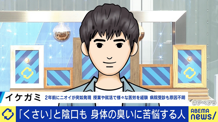 自身の体臭に悩みを抱える、大学生のイケガミさんが登場。2年ほど前から自身の体臭が気になり始めたそうで、通っている大学や公共交通機関で、周囲の人から咳払いや鼻をすする仕草を突然されるようになったと語ります。
