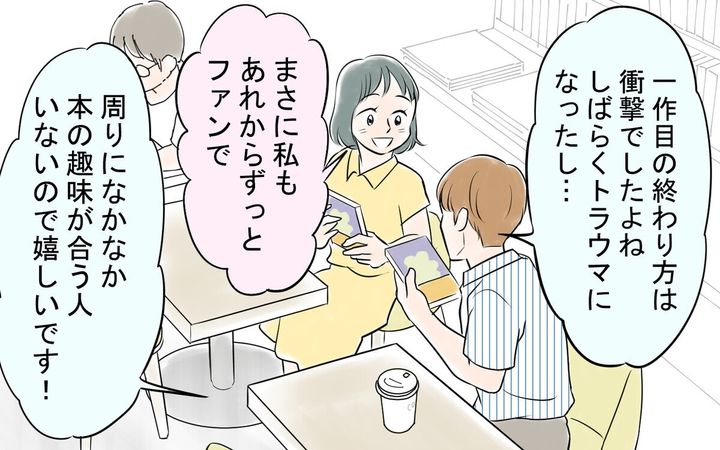 マッチングアプリでドタキャンされた咲良。落ち込みながらもブックカフェで本を読んでいると、同じ本を持っていた太一に話しかけられます。お互い本の話で盛り上がり、さらに話し込みます…。