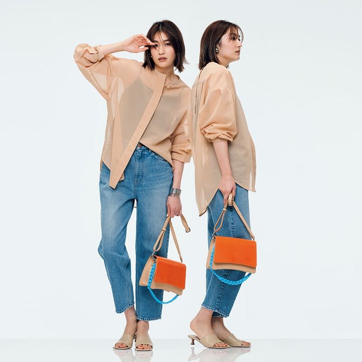 柔らかい素材が多い透けトップスですが、その中でも生地が厚めでゆったりとしたものをデニムと合わせてメンズっぽく。ブラウス¥20,900(ジャーナル スタンダード レサージュ/ジャーナル スタンダード レサージュ銀座店)デニム¥22,000(レッドカード トーキョー/ゲストリスト)バッグ¥7,150(キャセリーニ)サンダル¥53,900(ペリーコ/アマン)イヤリング¥3,150 バングル¥6,480(ともにアビステ)